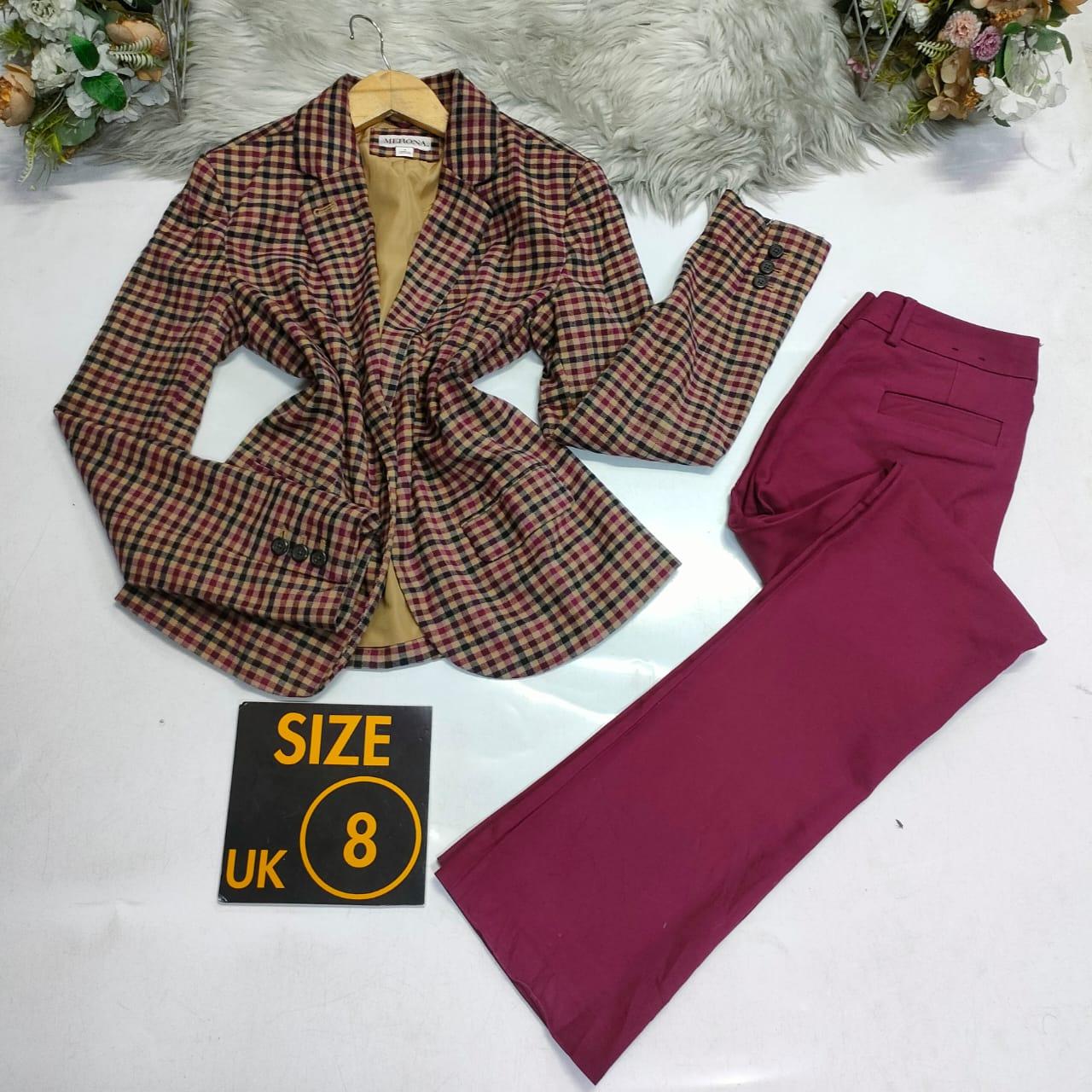 maroon pants with a checked blazer size 8,